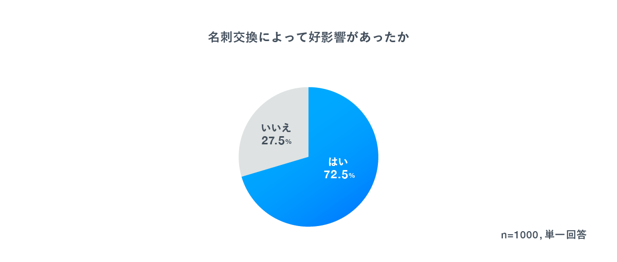 次に、これまでに名刺交換から好影響があったかどうかを聞いたところ、72.5%のビジネスパーソンが好影響を受けたことがあると回答しました。多くのビジネスパーソンが名刺交換によって得られる情報に価値を感じていることが分かりました。