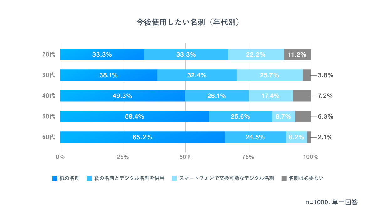 「今後使用したい名刺」年代別の回答では、60代の65.2%が「紙の名刺」と回答しているのに対し、20代では33.3%と60代の約半数という結果となりました。特に若手ビジネスパーソンが今後「デジタル名刺」「紙の名刺とデジタル名刺の併用」を希望していることが分かりました。