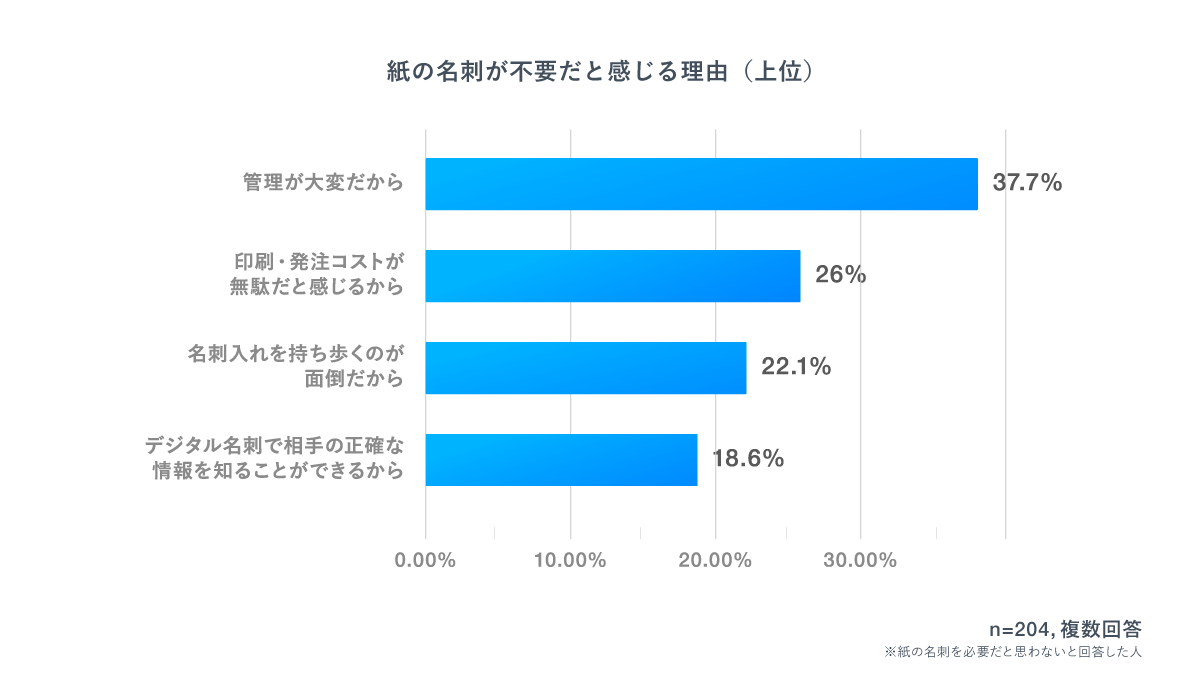 紙の名刺の必要性を問う質問で「紙の名刺を必要だと思わない」と回答したビジネスパーソンに理由を聞いたところ、「保管が大変だから」が37.7%、「印刷・発注コストが無駄だと感じるから」が26%、「名刺入れを持ち歩くのが面倒だから」が22.1%、「デジタル名刺で相手の正確な情報を知ることができるから」が18.6%という結果となりました。