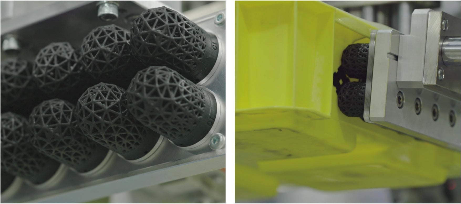 通い箱の荷積み・荷下ろしを自動化するロボットでの活用に向けて、トヨタ自動車株式会社モノづくりエンジニアリング部での評価をスタートしています。これまで、様々な規格・形状の通い箱が混載されている状況下では、「箱を安定して把持できない」ことや「箱が割れてしまう」ことがあり自動化が困難でした。これを解決するために、ラティス構造の柔軟指を使っていただいています。