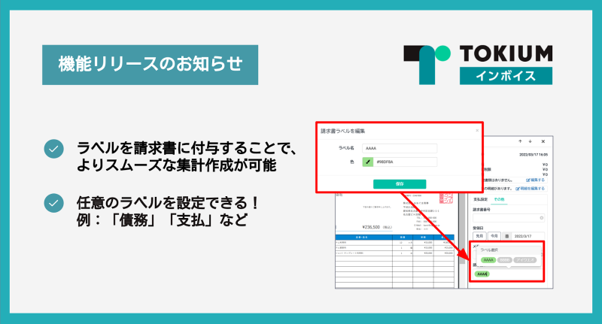 株式会社TOKIUM(本社:東京都千代⽥区、代表取締役:黒﨑賢一、以下「当社」)は、同社が提供する請求書受領クラウド【TOKIUMインボイス】の新機能として、請求書ごとにラベルを付与できる入力欄を追加しましたので、お知らせいたします。