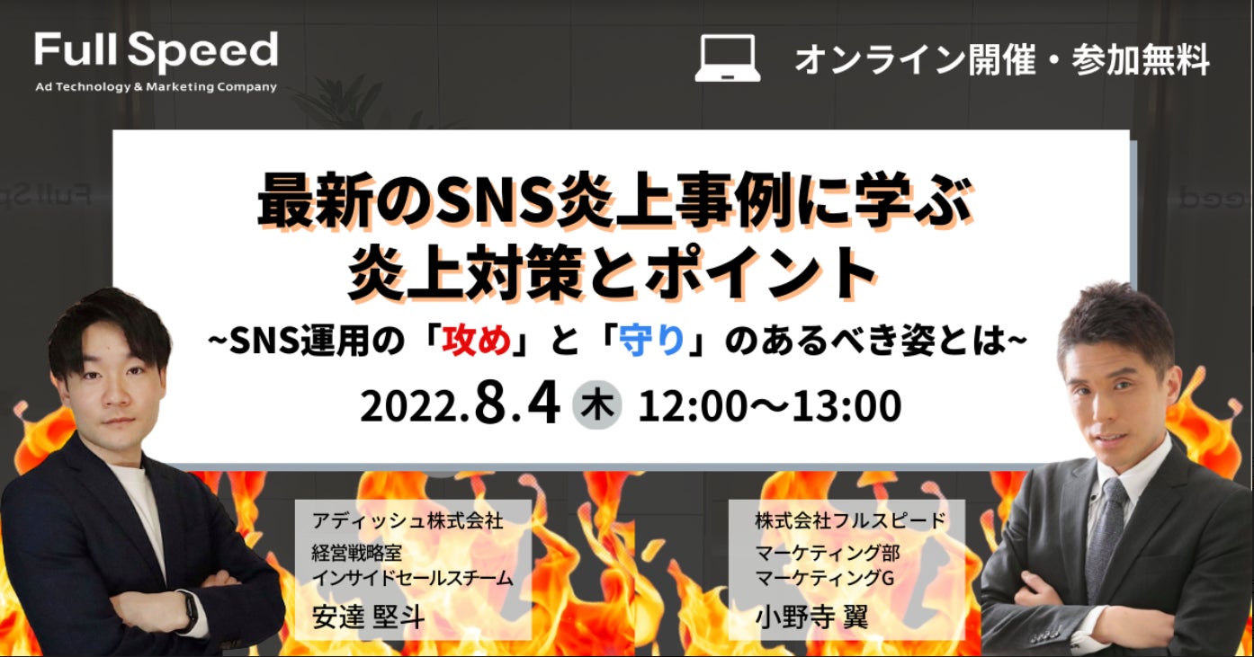 そこで今回は、多くの企業のSNSアカウント運用ご支援を担ってきた株式会社フルスピードとこれまで数多くの企業に炎上早期検知を支援してきたアディッシュ株式会社が、SNS運用体制のあり方を「攻め」と「守り」の両視点で徹底解説いたします。