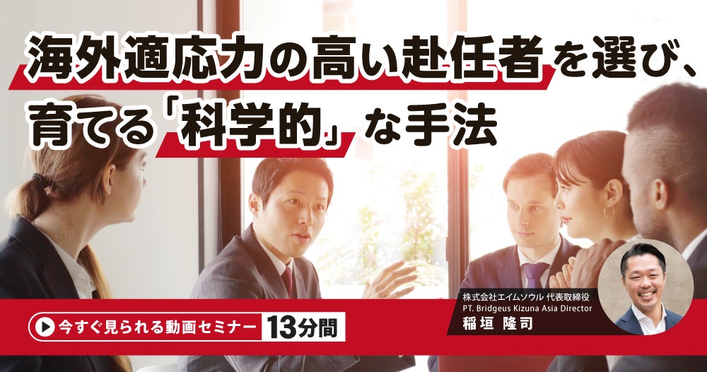 この問題に対して、科学的な方法で海外赴任者の選抜・育成を行う手法と、それを実施している他社事例をご紹介します。動画形式のためいつでも視聴でき、13分間にまとまっておりますのでお気軽にご視聴ください。