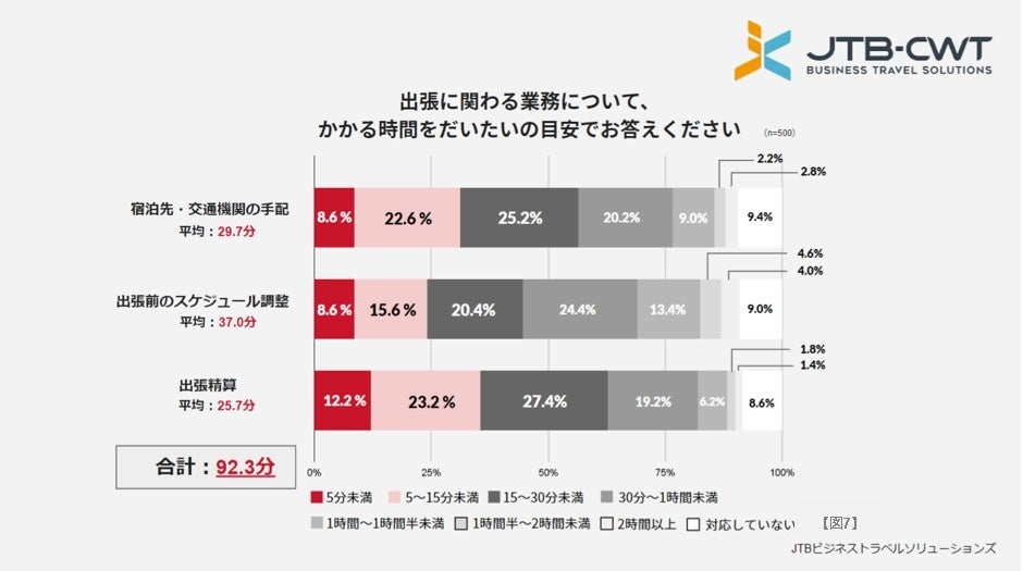出張に関わる周辺業務について、「宿泊先・交通機関の手配」「出張前のスケジュール調整」「出張精算」に要した合計時間を調べてみると平均で約92.3分かかっていることが明らかとなり、周辺業務の効率化が必要であることがうかがえます(図7)。