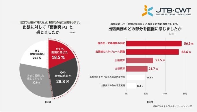 ◆出張回数が増えたことで47.3%が面倒になったと回答(図5)。原因は「宿泊先・交通機関の手配(56.5%)」「スケジュール調整(53.6%)」などの出張に関わる周辺業務(図6)。