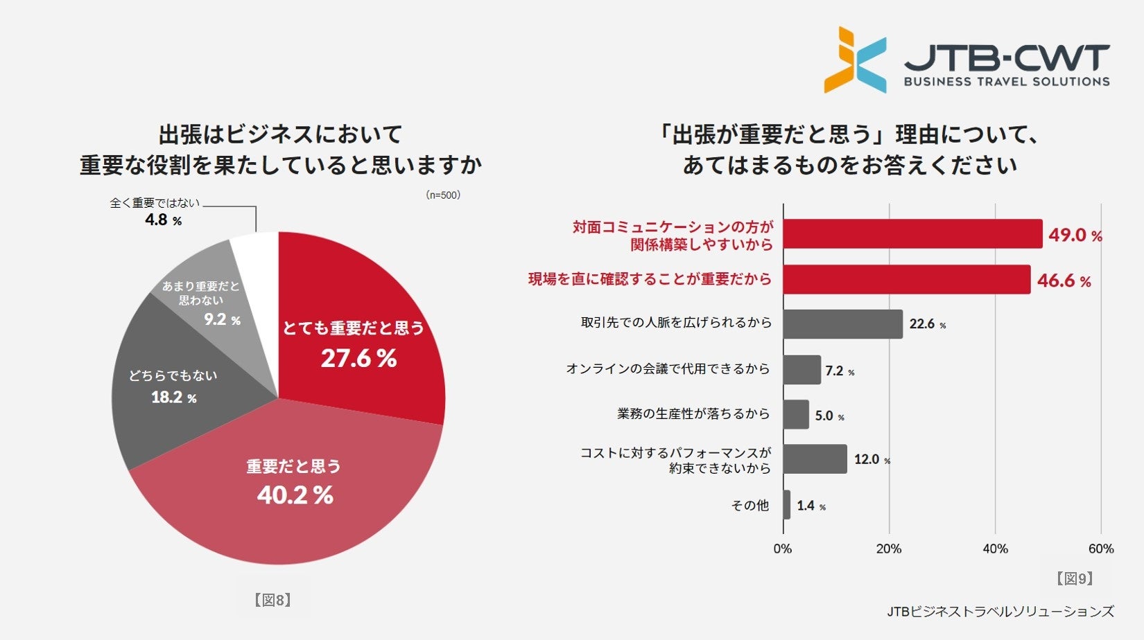 面倒という印象がある中で、出張自体は「ビジネスにおいて重要な役割を果たしている」との回答が67.8%となりました(図8)。その理由については、図9の通り「対面コミュニケーションの方が関係構築しやすいから(49.0 %)」、「現場を直に確認することが重要だから(46.6 %)」など、直接訪問することに意義を感じているケースが上位となりました。このことから、出張はビジネスマンにとって関係値構築における重要な手段として捉えられていることがうかがえます。