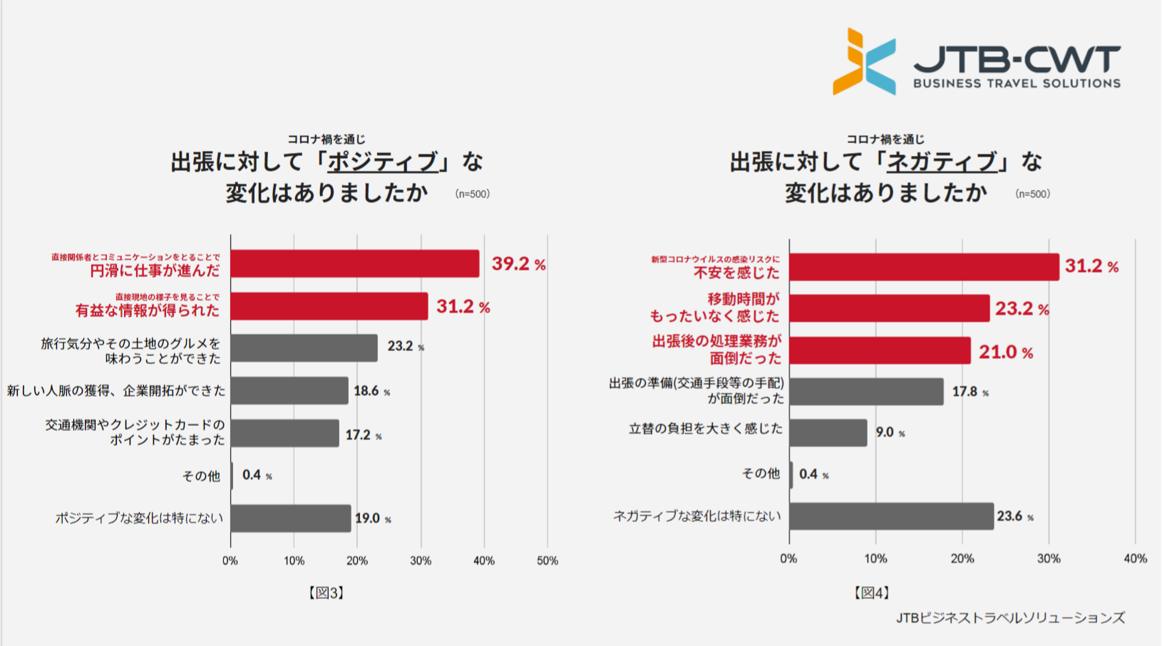 コロナ禍による出張制限を通じて、出張に対しポジティブ・ネガティブそれぞれ意識の変化が見られました。ポジティブな意識の変化(図3)では、「直接関係者とコミュニケーションをとることで円滑に仕事が進んだ(39.2%)」が最多。続いて、「直接現地の様子を見ることで有益な情報が得られた(31.2%)」と現地に赴くことへのメリットを感じています。