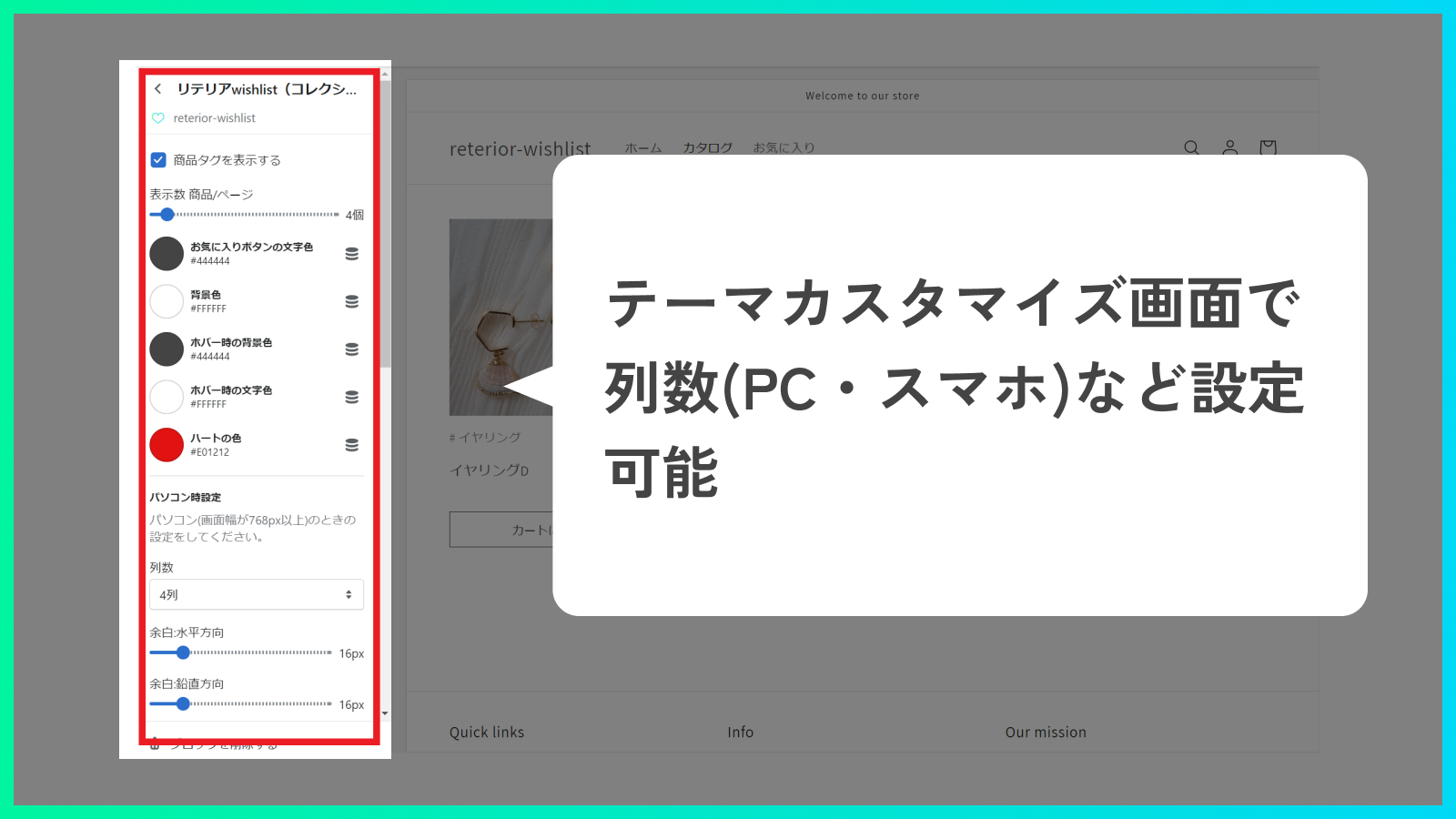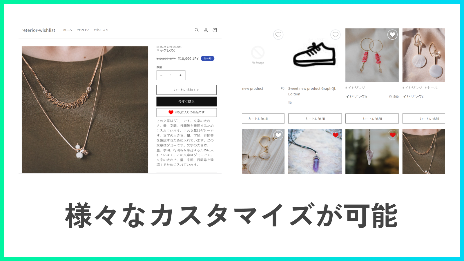 「らくらくお気に入り | リテリア wishlist」は、Shopify ストアに「お気に入り機能」を実装することができるアプリです。 お気に入り機能では、顧客が商品をお気に入り商品として登録することができます。また、ページを離れた後でもお気に入りページからお気に入り商品を確認することができるため、コンバージョン率UPも向上できます。