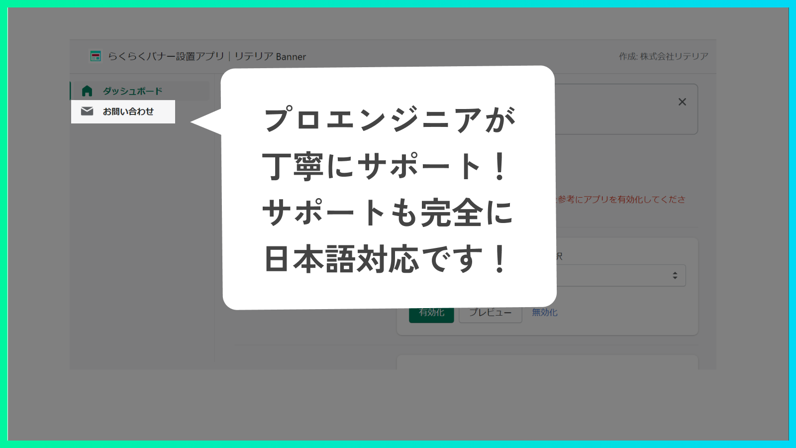 「らくらくお気に入り | リテリア wishlist」は、日本製のShopifyアプリであるため、サポートも日本語です。日本のエンジニアがアプリの導入を丁寧にサポートします。