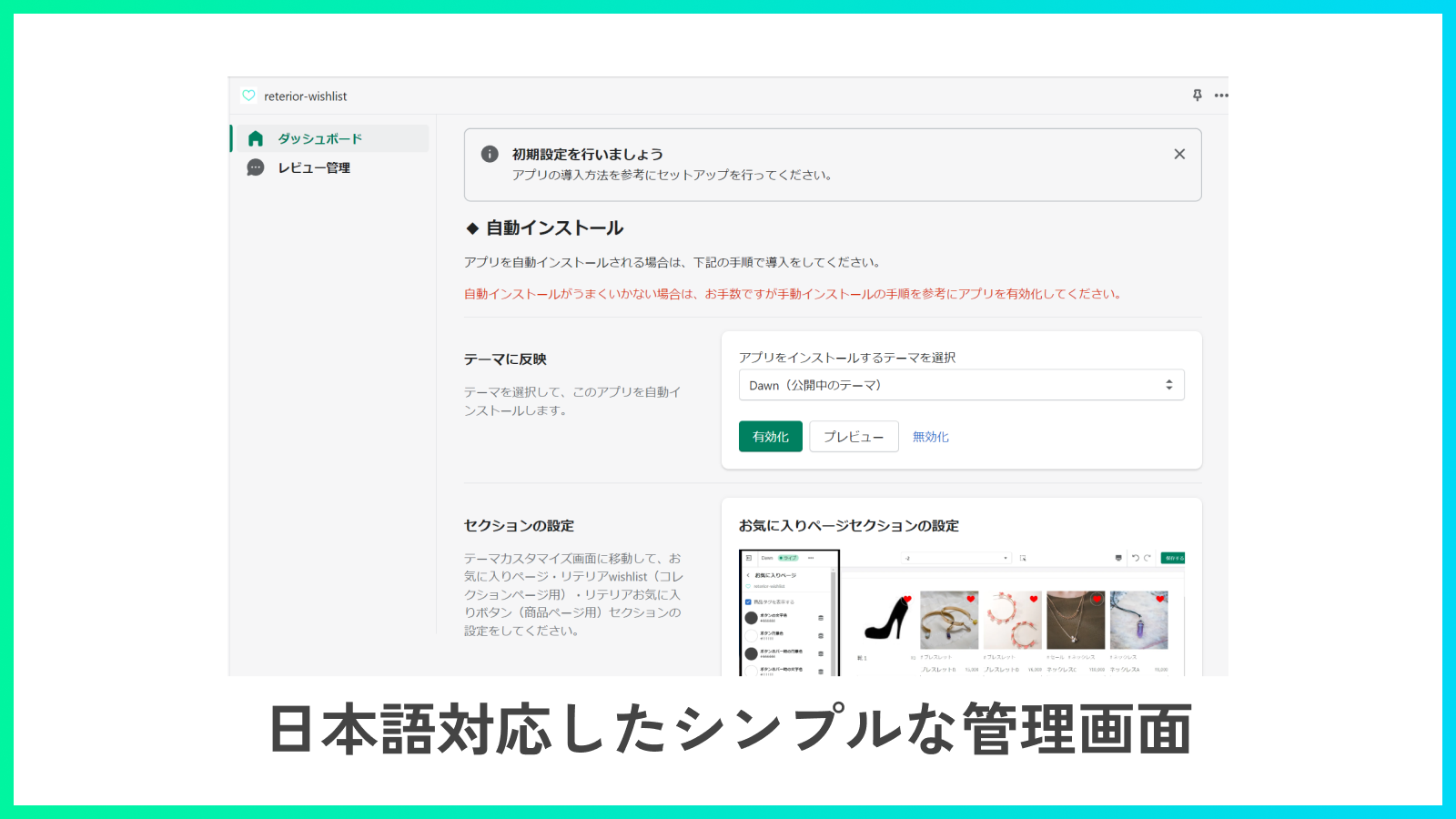 管理画面は日本語に完全対応しておりますので、英語が苦手な方でも安心してご利用いただけます。 日シンプルな管理画面であるため、簡単にShopifyアプリを導入することができます。