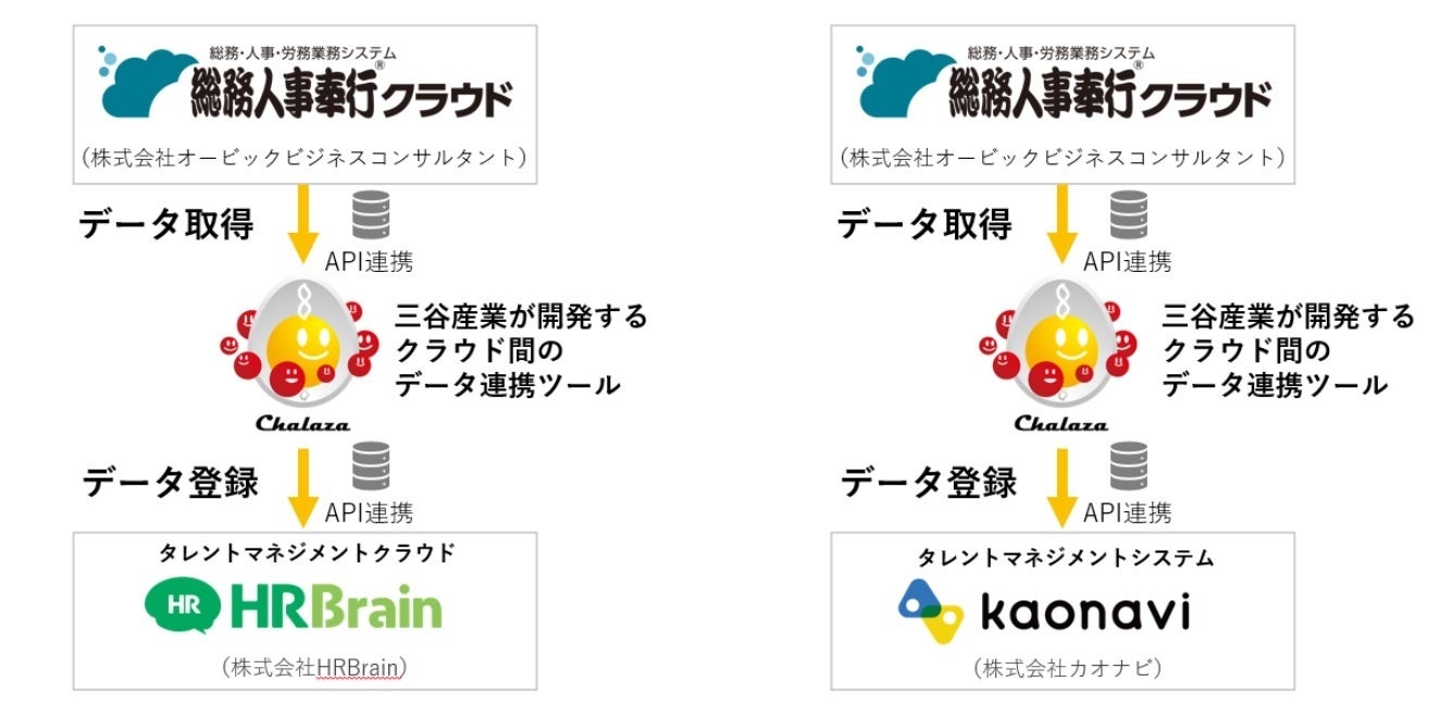 ■三谷産業が開発するクラウド間のデータ連携ツール「Chalaza」を活用した「奉行クラウド」シリーズのデータ連携モデルの一例
