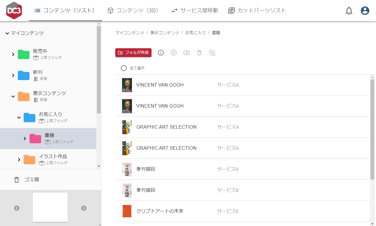DC3マイルームのコンテンツ管理機能では、自身の保有するDC3コンテンツを、サービスを横断して確認・整理することが可能です。DC3マイルームから各サービスを介してコンテンツを再生することもできます。