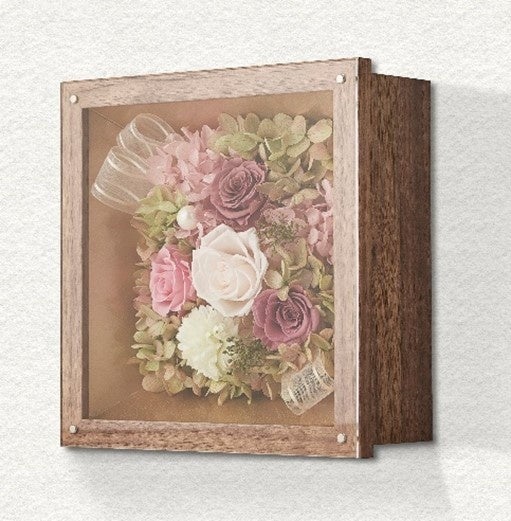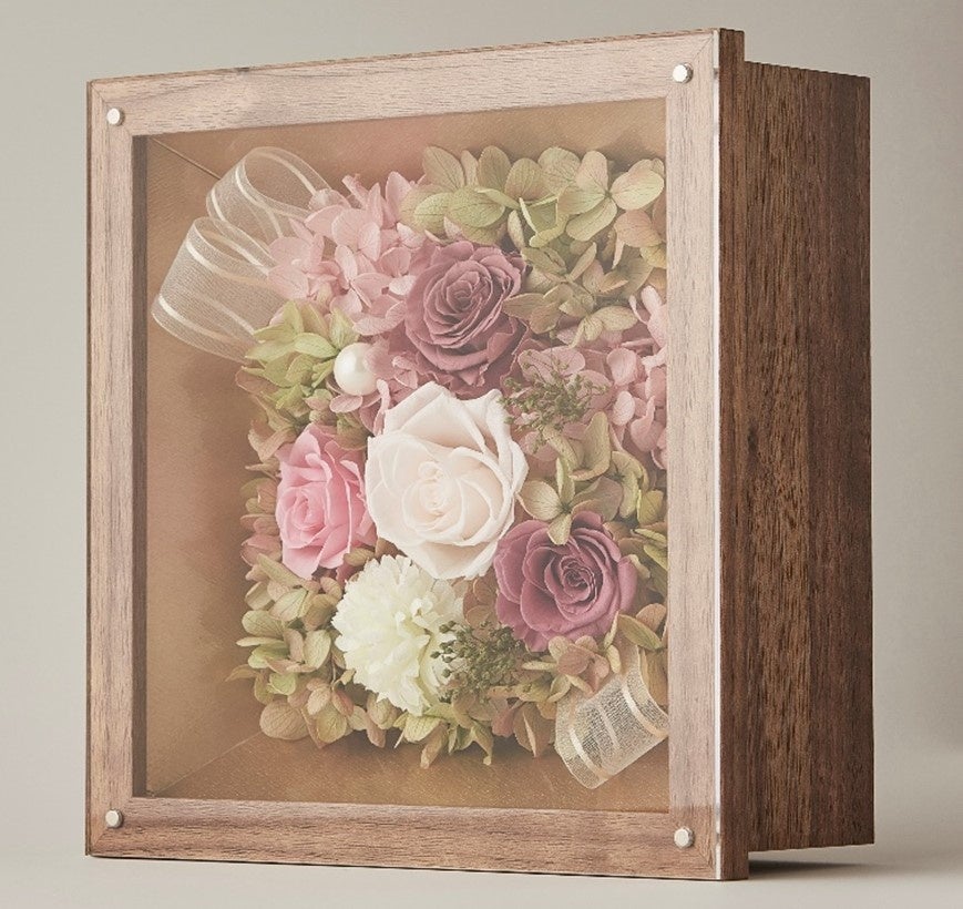 アンティークな色彩で柔らかな美しさを湛えたフラワーアレンジメントを、温かみのある木のフレームで包み、ご結婚や各種記念日はもちろん、ご昇進やご栄転、ご開店などのビジネスシーンにも幅広くお祝いの気持ちをお届けします。