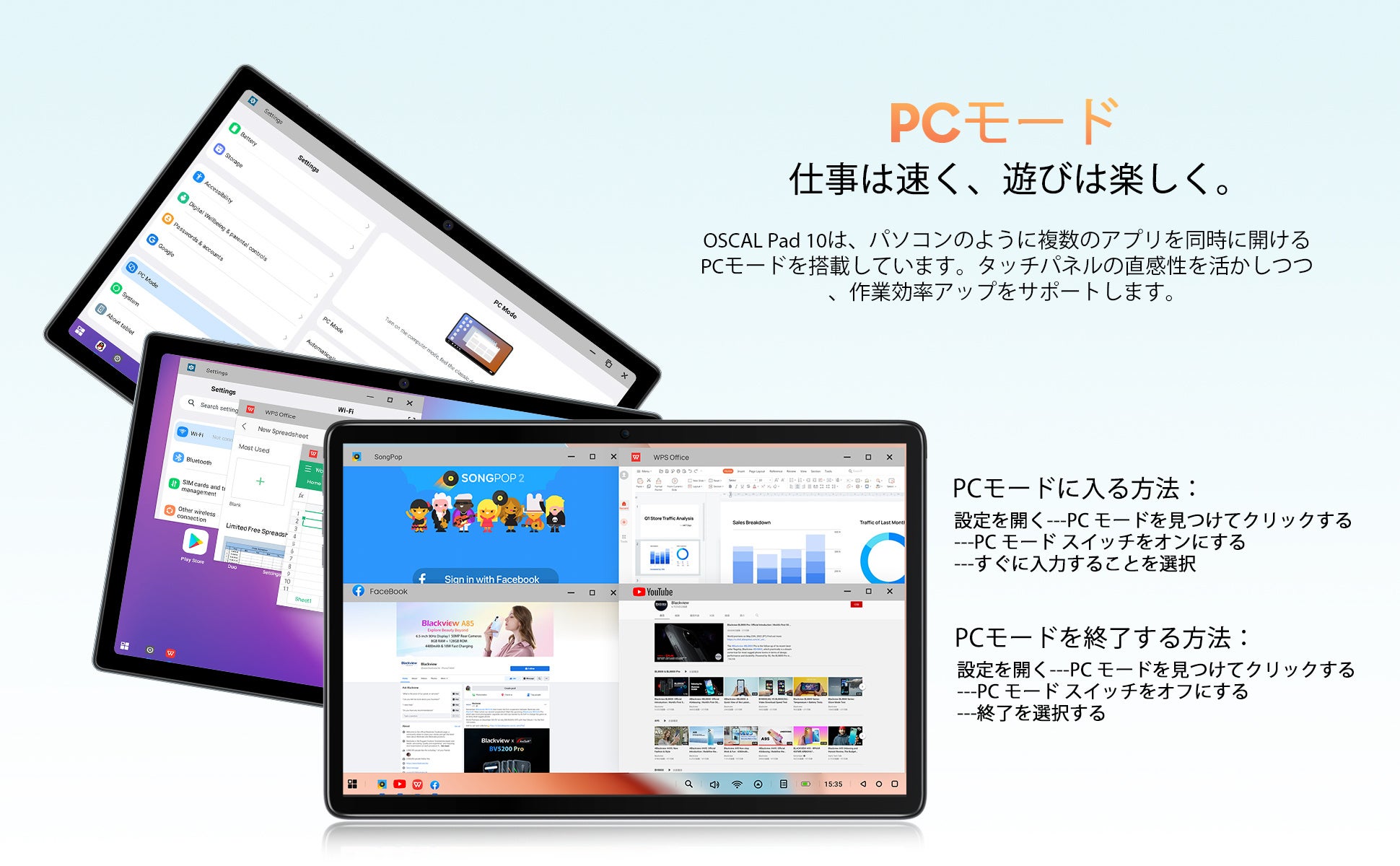 OSCAL Pad 10は、パソコンのように複数のアプリを同時に開けるPCモードを搭載しています。タッチパネルの直感性を活かしつつ、作業効率アップをサポートします。
