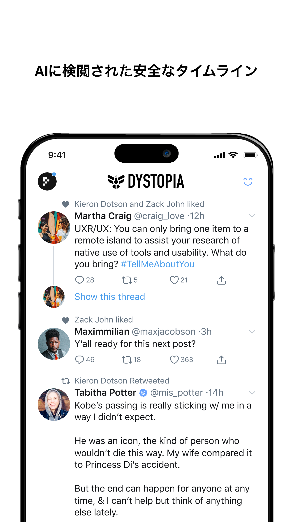 『DYSTOPIA』は誹謗中傷が含まれる不適切な文章をAIが検閲し、自動的に適切な表現に変換し投稿される、AIにより統制された誰も傷つくことのない新しいSNSです。このSNSには「被害者」も「加害者」も存在しません。