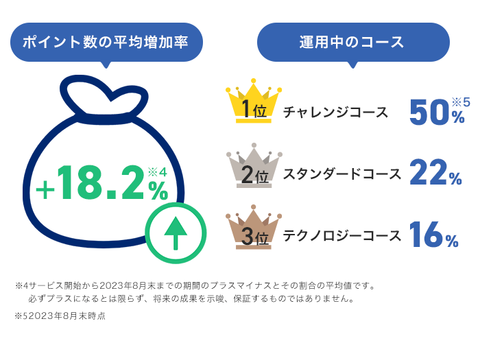 「ポイント運用」サービス開始時点から2023年8月末までのポイント運用者のポイント数の平均増加率は+18.2%(※4)となっています。また、米国の代表的な株価指数に連動して約3倍の値動きをする「チャレンジコース」が残高ベースで過半を占めています(※5)。直近では、生成AI関連の銘柄へ注目が集まっていることからGAFAM等のテック系企業に連動して値動きする「テクノロジーコース」へのポイント追加の割合も増加傾向にあります。