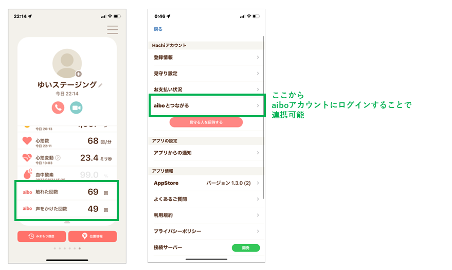 今回のサービス連携により、aiboとお過ごしになっている「見守られる方」が、aiboに「触れた回数」「声をかけた回数」を、Hachiアプリから閲覧することができるようになります。