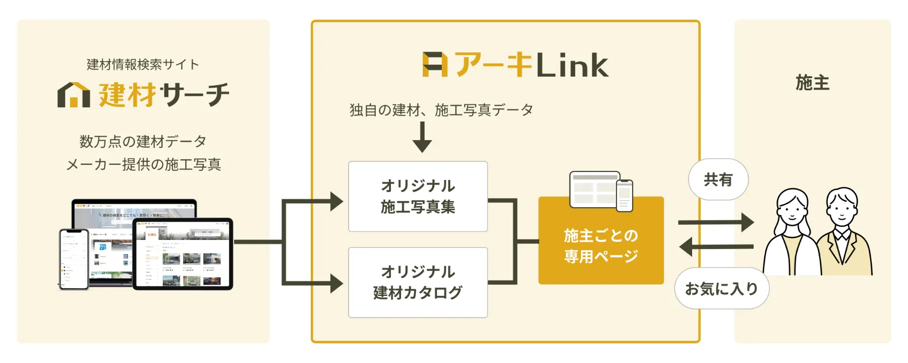 「建材サーチ」のデータベースから、オリジナルの建材カタログや施工写真集を作成できるので、施主がお気に入り登録した情報をもとに、要望に合わせたスムーズな提案が可能に。「アーキLink」を使うことで、打ち合わせ回数の削減と受注確度のアップが期待できます!