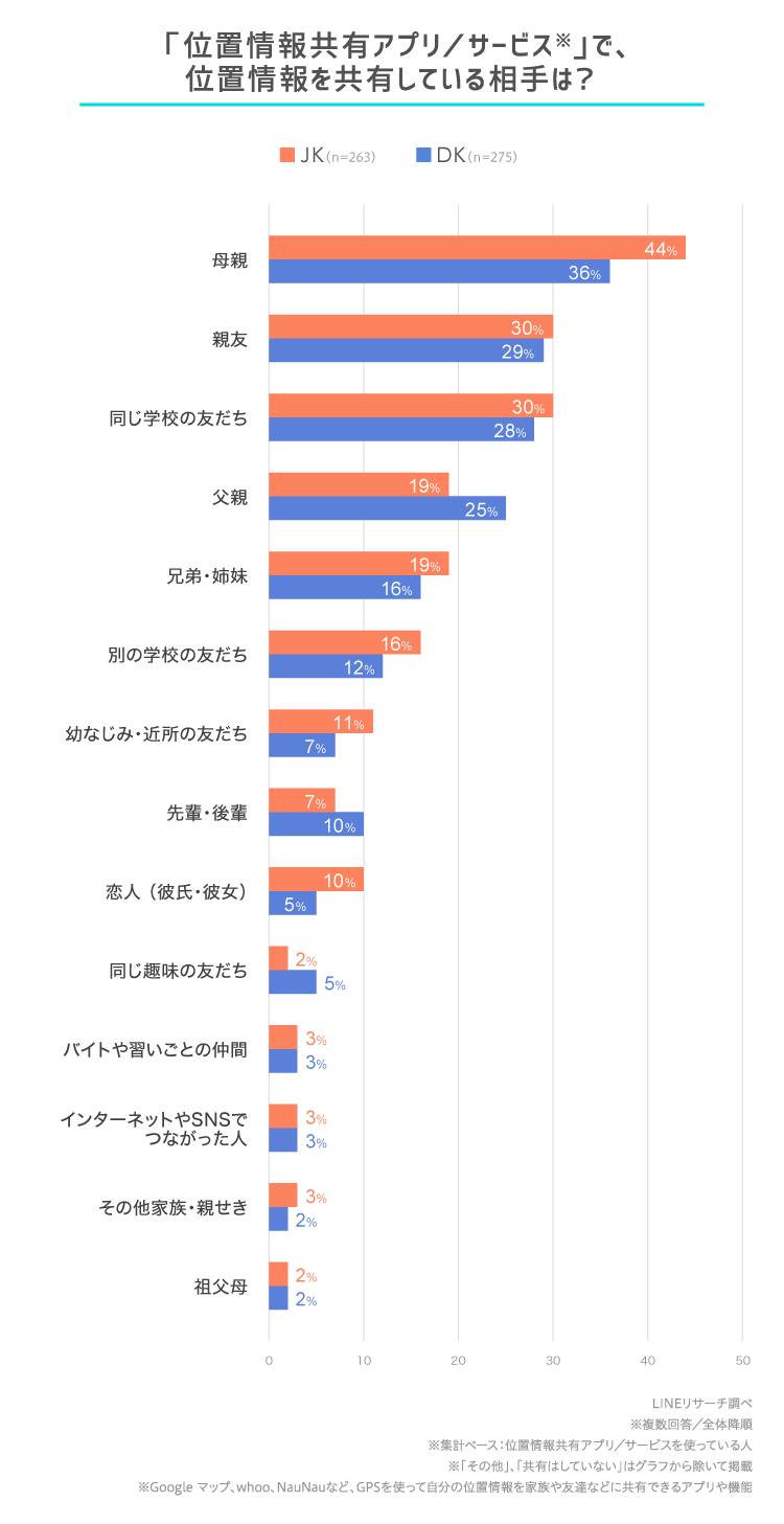 「恋人(彼氏・彼女)」は、1割台となりましたが、男子高生より女子高生の方が恋人に位置情報を共有している人が多い結果になりました。