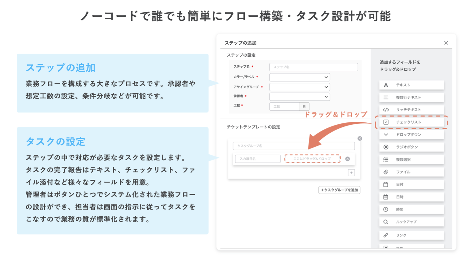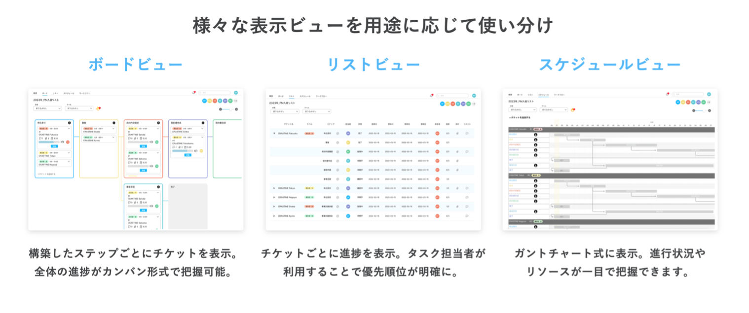 「フローラ」は、各業務のステップに応じて「チケット」と呼ばれる課題やタスクを柔軟に追加できるシステムであり、ユーザーはノーコードの簡単な操作で業務フローを構築できます。また、発行されたチケットの数や処理された数を簡単に確認できるため、業務の進捗状況を迅速に把握できます。これにより、業務内容や管理方法にバラつきがあった不動産の管理と運用業務を効率化しました。