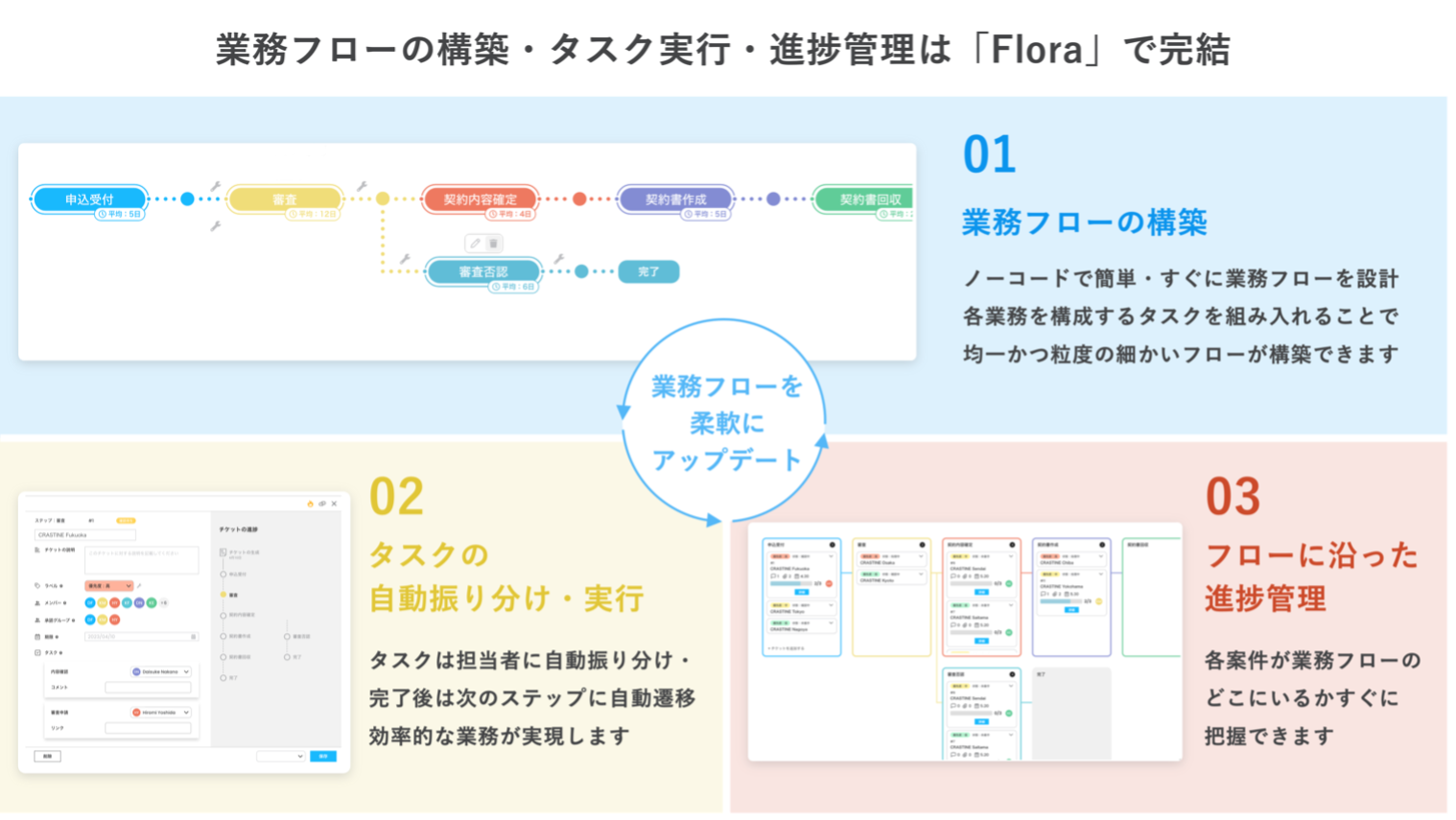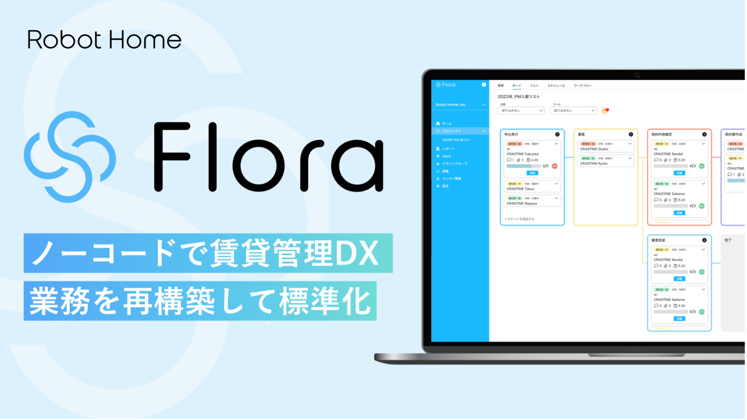 当社は、不動産業界での豊富な経験と、AI・IoT開発などの最新テクノロジーソリューションを土台に、多岐にわたるシステム開発に取り組んでおります。新しく開発された「フローラ」は、不動産の管理と運用業務で行われていた従来のスプレッドシートに依拠する業務プロセスではなく、見える化された業務フローに沿ってあらゆる業務を進め、効果的な管理を可能にする業務フローマネジメントシステムです。