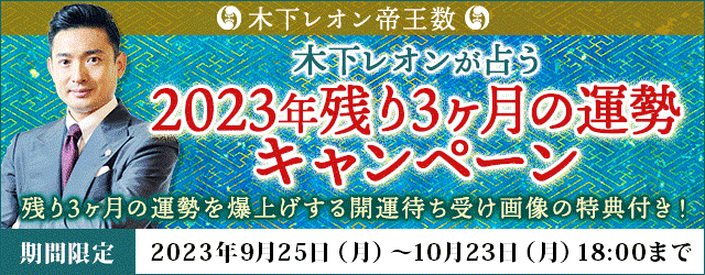 フジテレビ系列で放送中の占い番組『突然ですが占ってもいいですか?』で人気を博している木下レオン。ただいま、月額公式サイト『木下レオン◆帝王数』にて、2023年の残り3ヶ月のあなたの運勢が分かる『2023年残り3ヶ月の運勢キャンペーン』を開催中です。キャンペーン期間中、対象の占いメニューを購入すると、占いカテゴリ別で残り3ヶ月の運勢を爆上げしてくれる開運待ち受け画像がダウンロードできます。ぜひこの機会にお試しください。