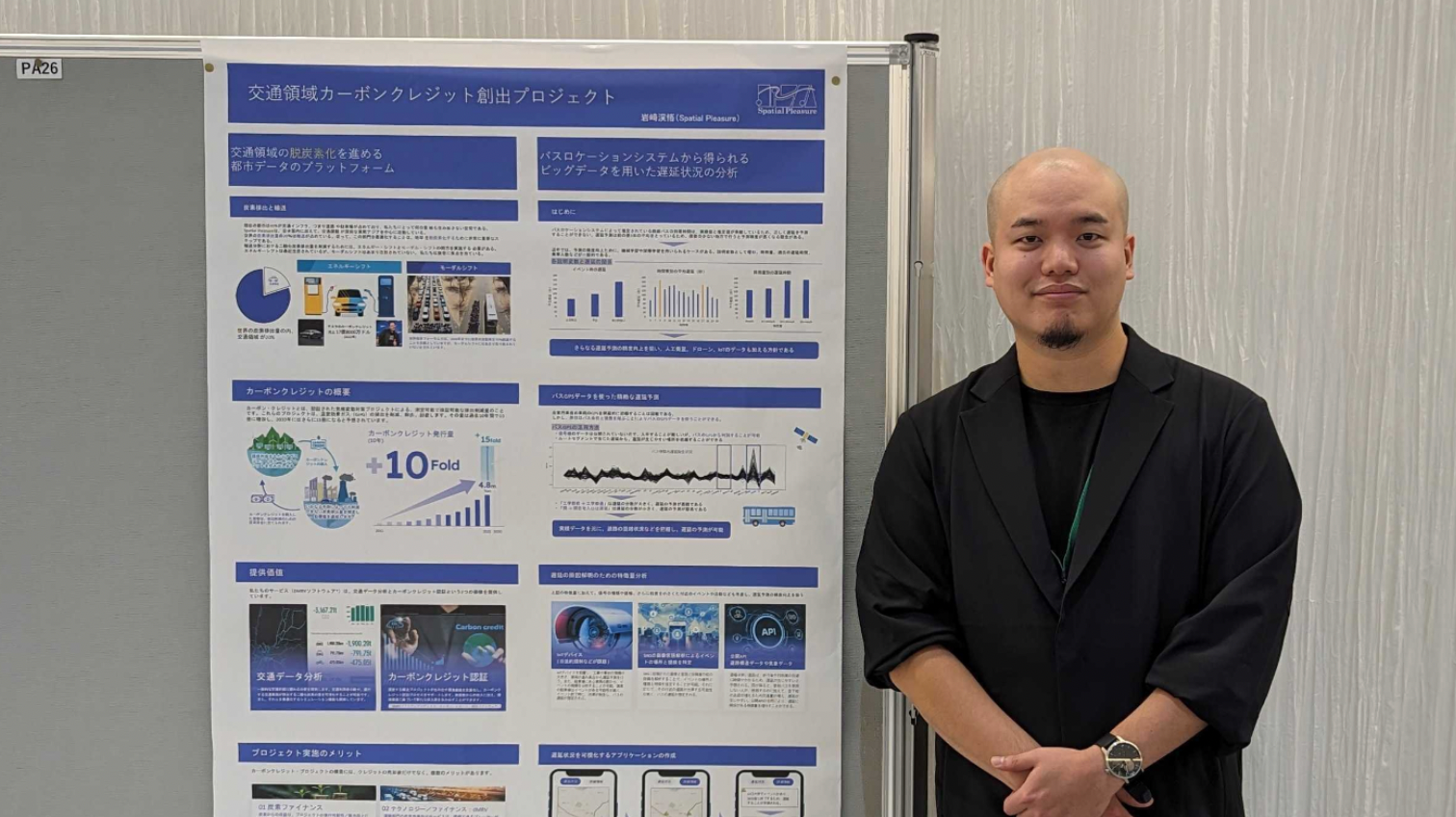国内バス事業者への展開サービスを軸に、2つのテーマを取り上げました。第1のテーマは「バスのカーボンクレジット創出」に関するものです。バス運行が都市全体のカーボン排出量を削減する効果があるにも関わらず、現状ではバス会社の環境便益が適切に評価されていない問題を指摘。科学的にバスのモーダルシフト効果による環境価値を定量化することでカーボンクレジットを創出できる可能性を紹介しました。第2のテーマは「バスロケーション」についてで、現行のバスロケーションシステムの遅延予測の課題を取り上げ、深層学習を用いた遅延予測の新しいアプローチを紹介しました。