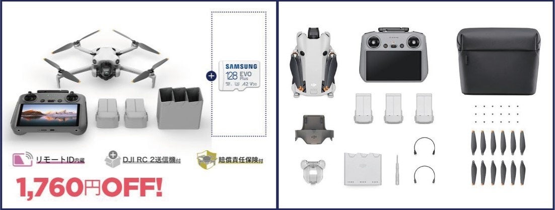Mini 4 Pro に、高輝度モニターを内蔵した送信機や予備バッテリー、充電ハブ、予備プロペラ、ショルダーバッグなどをまとめた Fly Moreコンボ Plus に、メーカー推奨の高速転送 microSDカード[128GB]を合わせたお得なセットです。