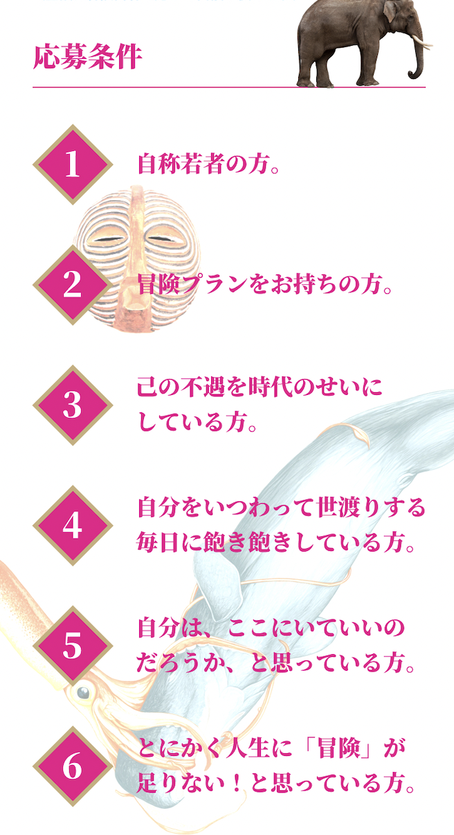 一人で世界に旅立ち、自由でなんでもできてしまう今回の冒険。だからこそ、「絶対にこれをやり遂げたいんだ!」というだれにも負けない信念が求められます。今回私たちが求めている人物像は6項目。“真の冒険者”を探しています。