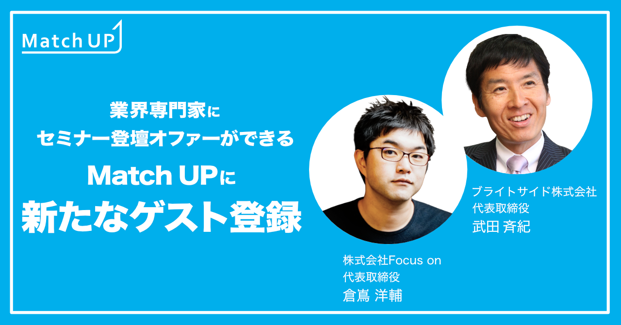 当社は、国内最大級のオンライン展示会「ITトレンド」や、ビジネス動画プラットフォーム「チラヨミ」を通して、多くの企業様、業界専門家の方とのお取引があり、自社のマーケティングノウハウを活かし、このような課題を解消するため、業界専門家にセミナー登壇オファーができるマッチングプラットフォーム「Match UP」の提供を開始いたしました。
