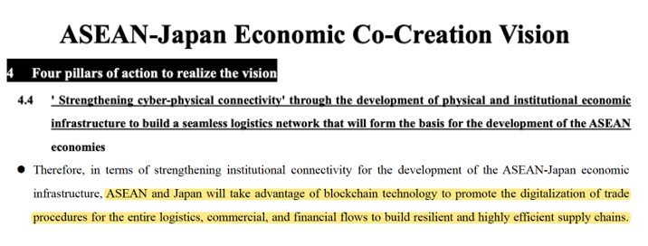 対象となる4つの方針のうち「サイバー・フィジカルコネクティビティの強化」では、インド太平洋経済枠組(IPEF)の具体化や、シームレスな物流網構築に向けた、貿易手続きの撤廃・デジタル化、DFFT(自由で信頼あるデータ流通)が、そして、その施策としては「ブロックチェーン技術を活用した、日ASEANにおける商流・物流・金流の貿易手続きデジタル化・連携」が述べられています。トレードワルツは日本国内で唯一、ブロックチェーン上で商流・物流・金流の貿易手続きをデジタル化するプラットフォームとして、この方針に沿って、ASEAN各国と協働し、日ASEANでの貿易デジタル化の取組を進めています。