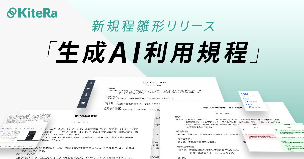 ための明確なルールが不可欠です。そこで、就業規則をはじめとする社内規程管理クラウドサービス「KiteRa」を提供しています。当社はこれまでも企業のニーズに応える新機能の開発を継続的に行ってきました。そして今回、その一環として業界初となる企業向け『生成AI 利用規程』をリリースいたします。