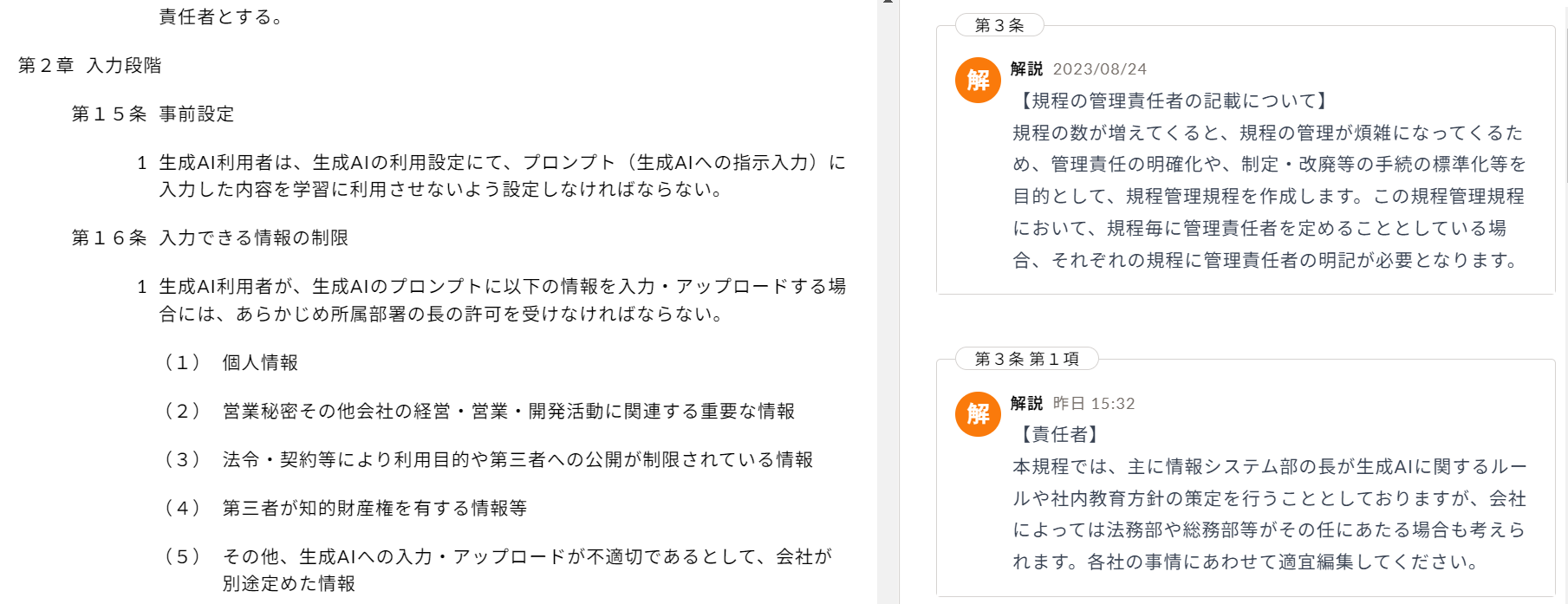 「解説」では、なぜ規程内で本項目を設ける必要があるのか、どのように自社に合った文言に規程を修正すべきかなどを解説しています。