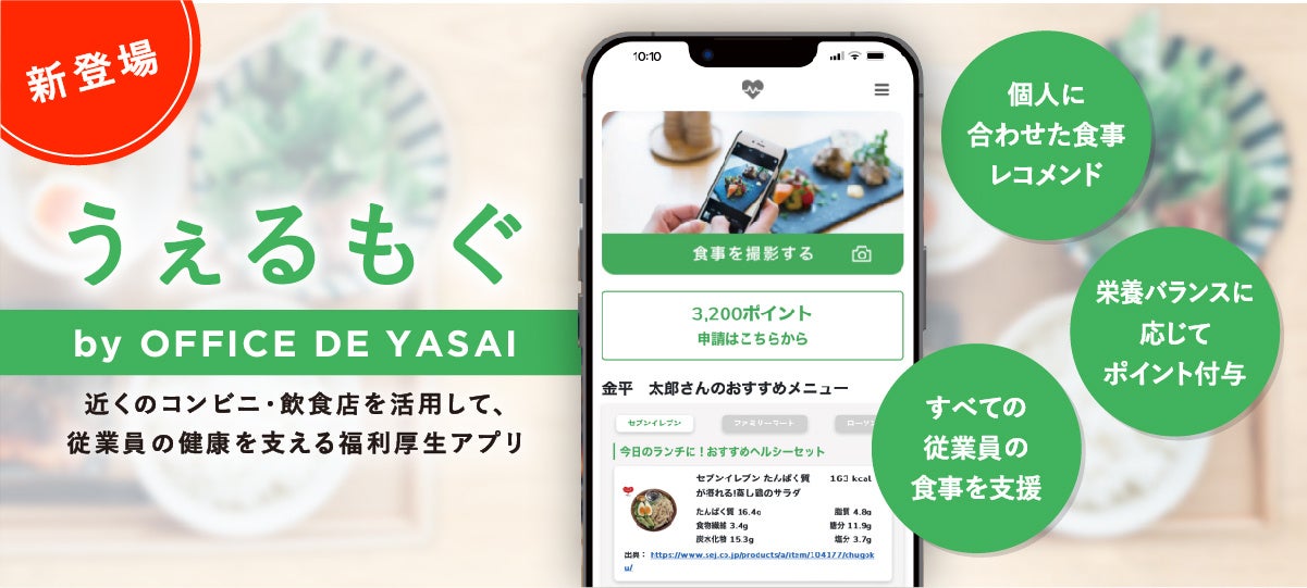 うぇるもぐは、全国のコンビニエンスストアや飲食店を対象に、個人の健康状態に合わせた食事をレコメンドし、食事の栄養バランスに応じてポイントを付与することで食事の指導と支援を同時にできる福利厚生アプリです。