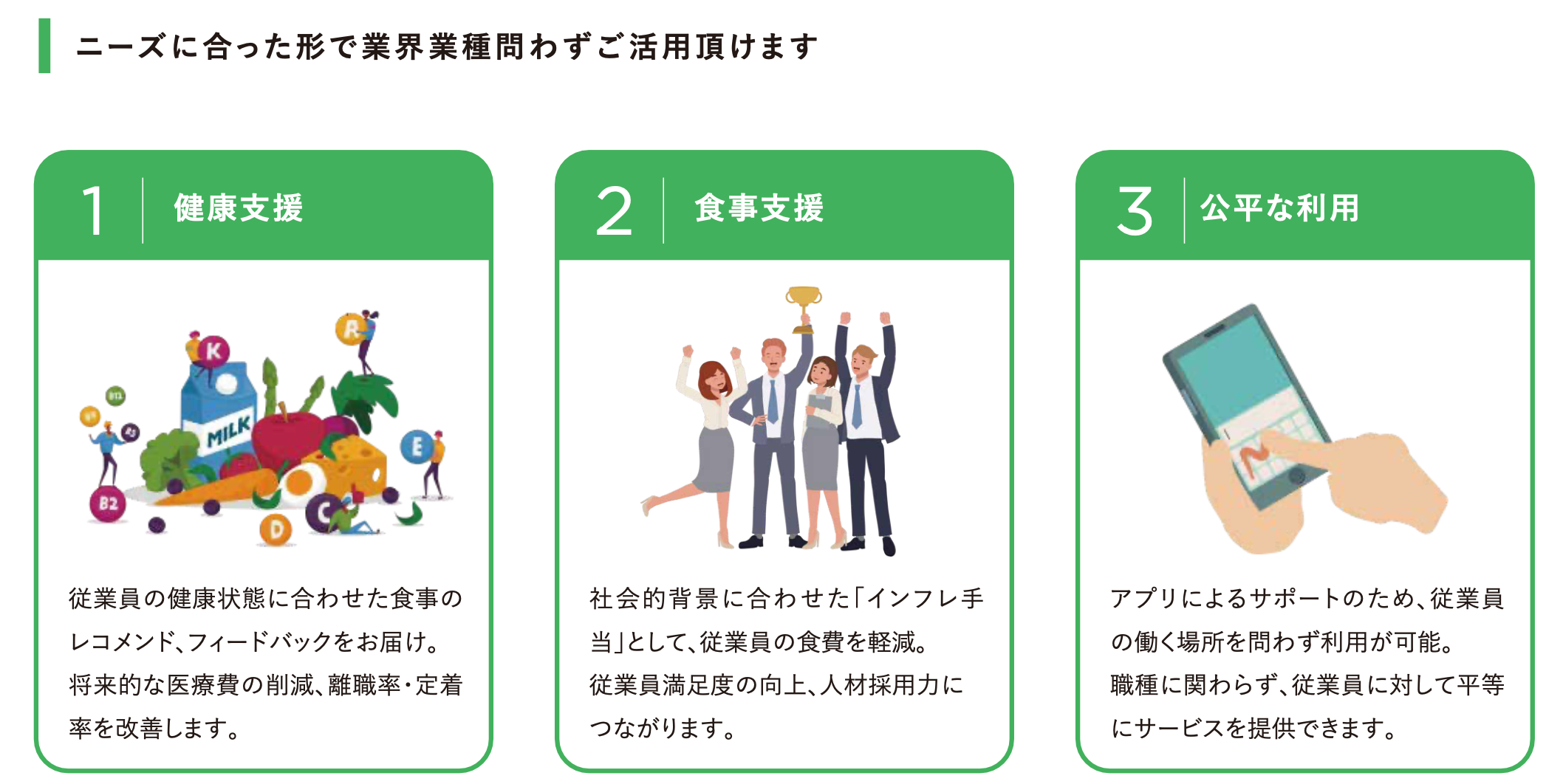 年齢・性別・体重・活動量などのヘルスデータと日々の食事の傾向から、AIが個人の健康状態に合わせた食事のメニューをレコメンドします。また、その日の食事をアプリで撮影するとAIが食事内容を採点し、管理栄養士監修の食事指導を受けることができます。健康的な食事ほど高得点になり、得点に応じてポイントが付与されます。貯まったポイントは現金などに交換でき、従業員の健康と食生活を支援することが可能です。