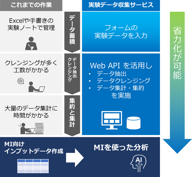 そこで昨今急速に進歩しているのが、AIなどのデジタル技術を材料開発に活用する技術「マテリアルズ・インフォマティクス」です。公開された論文データや特許情報に加え、企業内での実験・シミュレーション結果などから得られたデータを読み込ませ蓄積して利用する手法が広まりつつあります。これにより、新規物質の発見や開発期間の短縮といった効果が期待されています。