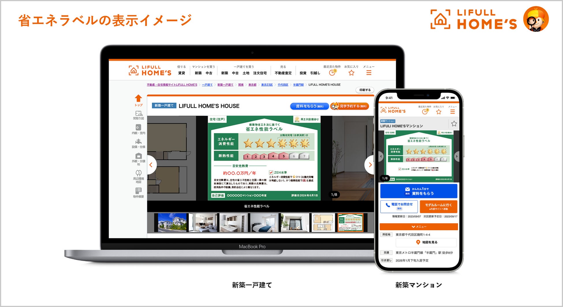 また、LIFULL HOME’Sに掲載される物件広告上で、省エネ、再エネの性能を表示する仕様に改修を行う予定です。以下のイメージ図のように、エネルギー消費性能を星印の数で分かるようにしたり、年間の目安光熱費、断熱性能の等級を見せる事で、消費者が客観的な指標で評価された省エネ性能をひと目で確認できたりするようになります。