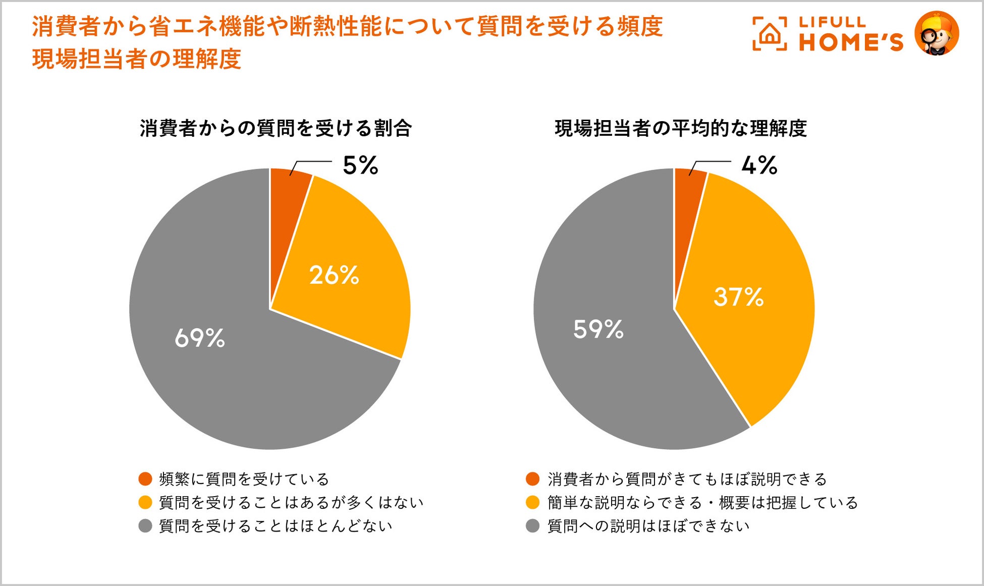 「過去1年以内に、貴社の現場の販売または賃貸担当者は、消費者(エンドユーザー)から、取り扱う物件の省エネ性能や断熱性能などについての質問をどの程度受けましたか?」に対しては、「質問を受けることはほとんどない」が約7割となっています。また、「貴社の現場の販売または賃貸担当者は、一次エネルギー消費量や建物の外皮性能について、どの程度理解していますか?現場担当者の平均的な理解度をお選びください。」に対しては、質問への説明がほぼできないが約6割となりました。