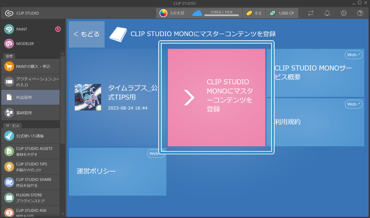 CLIP STUDIO PAINTから登録されたマスターコンテンツは、CLIP STUDIO MONOにダイレクトに登録されます。CLIP STUDIO MONOは、マスターコンテンツからコンテンツを製造する機能を備えています。製造したDC3コンテンツをCLIP STUDIO MONOのマーケットに出品することで、「CLIP STUDIO」サービス内で利用できるポイント、CLIPPYを使って流通させることができます。