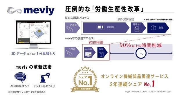 meviyは、機械部品の見積もり、製造をデジタル化。2D図面の作成から見積もりの取得までの、何十時間もかかる作業を、1分に短縮しました。部品の設計データ(3DCADデータ)をアップロードすると、AI が即時に価格と納期を回答、製造プログラムの自動生成により最短1日出荷を実現しました。