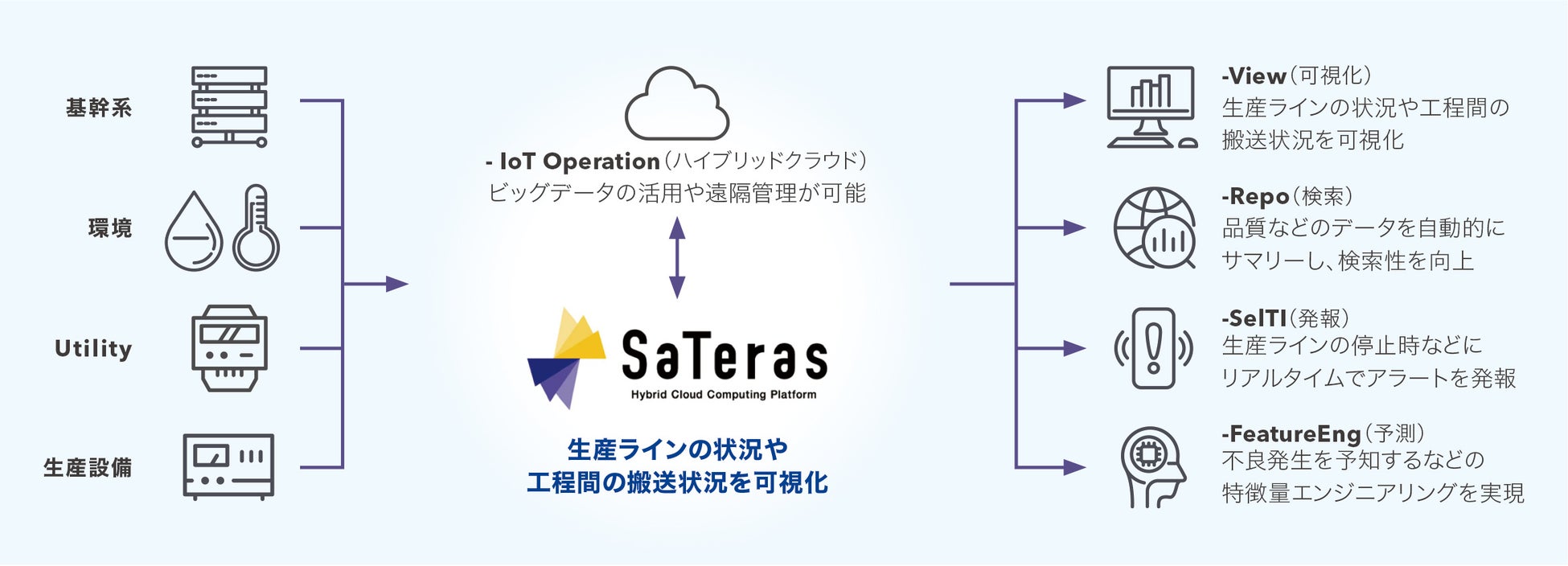 「SaTeras」は製造現場での脱属人化、超高齢化社会対応などの課題を解決するために、今まで培われた生産データの活用や暗黙知を構造化して形式知に変え、データを利用して誰でも製造することのできる環境を提供し、さらに情報の上位連携を可能としたシステムです。必要な機能・サービスを組み合わせることが可能であるため、処理能力の増強に対しても柔軟な設計となっています。