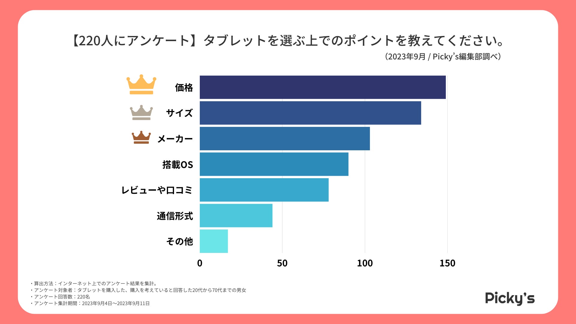 「価格」が最も重要視されていることが分かりました。「価格」は多くの人にとって決定的な要素であり、予算内で選択肢を絞る重要なポイントです。2位の「サイズ」は、タブレットの使いやすさや携帯性が考慮されていると考えられます。3位に「メーカー」が選ばれており、信頼できるメーカーから製品を選ぶことの安心感が示されていました。
