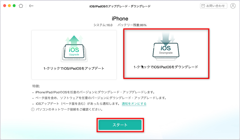 2.「1-クリックでiOS/iPadをダウングレード」モードを選択して、「スタート」ボタンをクリック