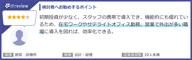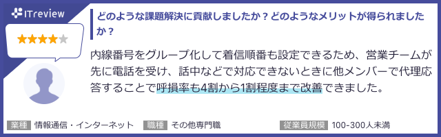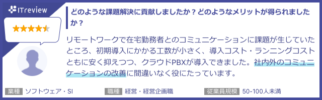 「トビラフォン Cloud」は「ITreview」で平均顧客満足度4.2を獲得しています(2022年7月21日時点)。当製品のご利用者様から実際に寄せられたレビューを一部ご紹介します。