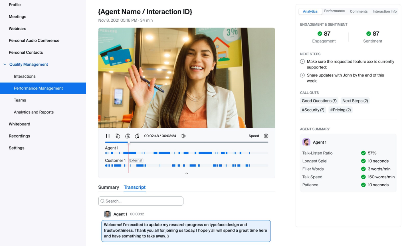 AI を活用した会話分析: 「適切な質問」や「次のステップ」、「インタラクション サマリー」によるコンテキストの把握、重要なトピックや指標のコールアウトによりインサイトを引き出し、会話をスキャンして改善すべき点を特定できます。