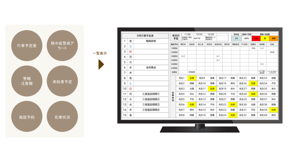 行事予定表や熱中症警戒アラート、施設予約表などのツールを職員室のサイネージで表示できる「職員室DXツール」として集約し、校務DXのはじめの一歩をサポートするツール群の他、学びのDX・セキュリティのDXを体感できるツール群を提供します。(ツールは随時追加予定)