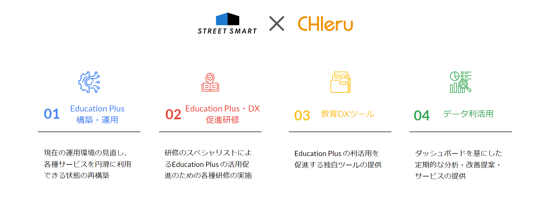 本サービスでは、Google Cloud パートナー企業であるストリートスマートおよび Google 認定パートナーのチエル社の強みを活かした4つの教育DX導入・推進支援をご提供いたします。