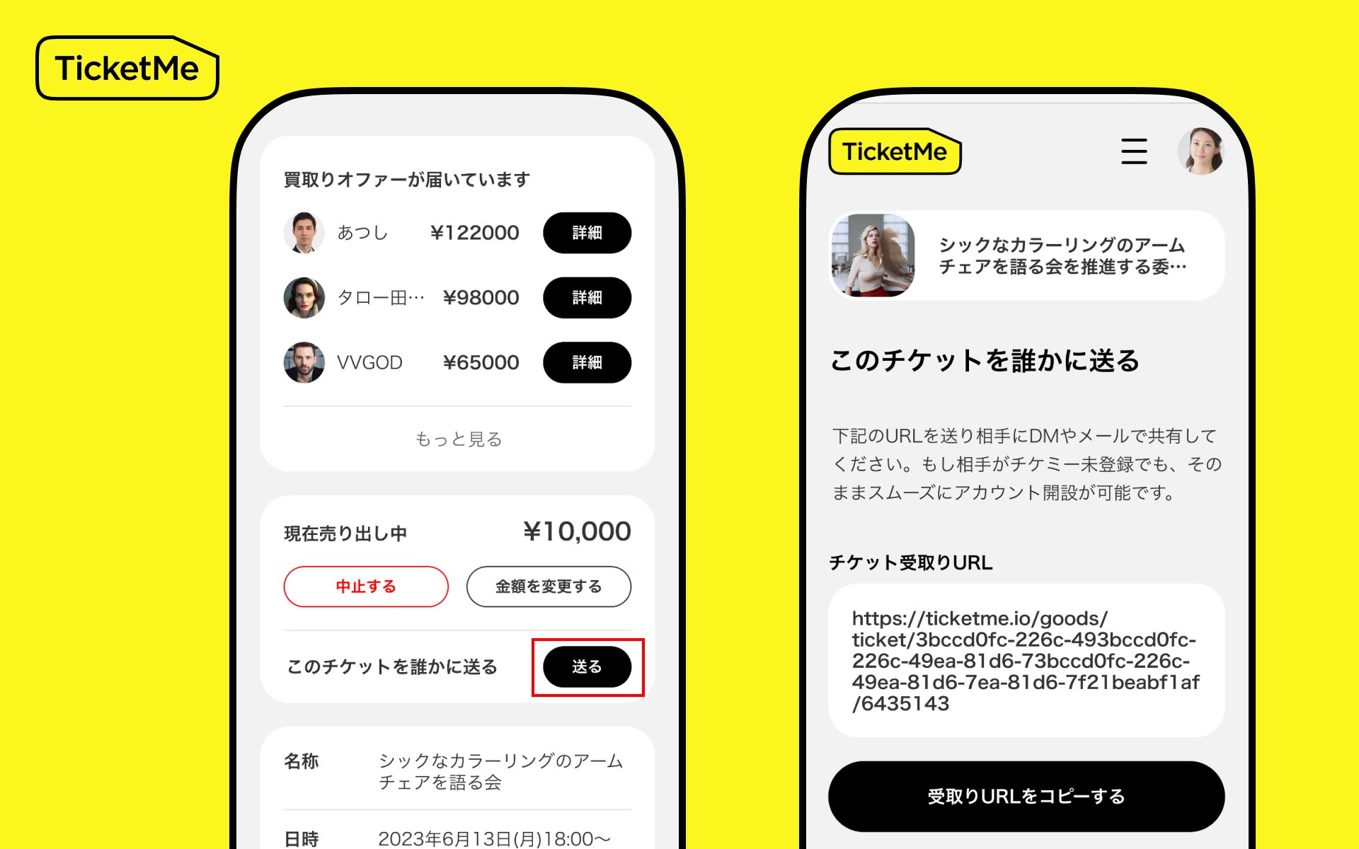 所有しているチケットを「送る」を選択すると、そのチケットを受け取るためのリンクが生成され、リンクをSNSやメッセージで共有すると、リンクにアクセスした人にチケットが送信されます。
