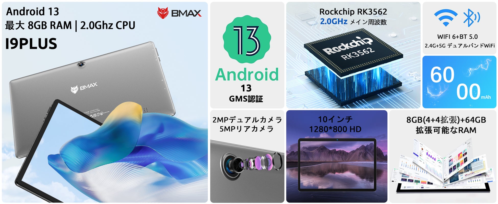 BMAX I9PLUS 10インチタブレットは新世代OSの「Android 13」を搭載し、Android13 OSは個人のプライバシー保護とセキュリティをアップグレードし、パーソナライズされた機能を強化し、基本的な流暢さを改善し、バッテリーの使用を最適化しました。GMS認証済みでGoogle Play ストアから全てのLINE / Netflix / YouTube /Facebook / Twitterなどお気に入りのアプリなど、お好きなアプリをダウンロードできます。I9PlusはCE、FCC、PSE認証を取得しています。