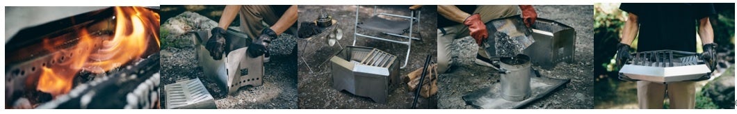 組み立て式の二次燃焼焚火台は、火床と灰受けが一体型となっており、灰の処理が非常に簡単な設計となっています。使用後はスタッキングできるよう設計された5つのパーツをコンパクトにまとめて簡単に持ち運ぶことが可能です。